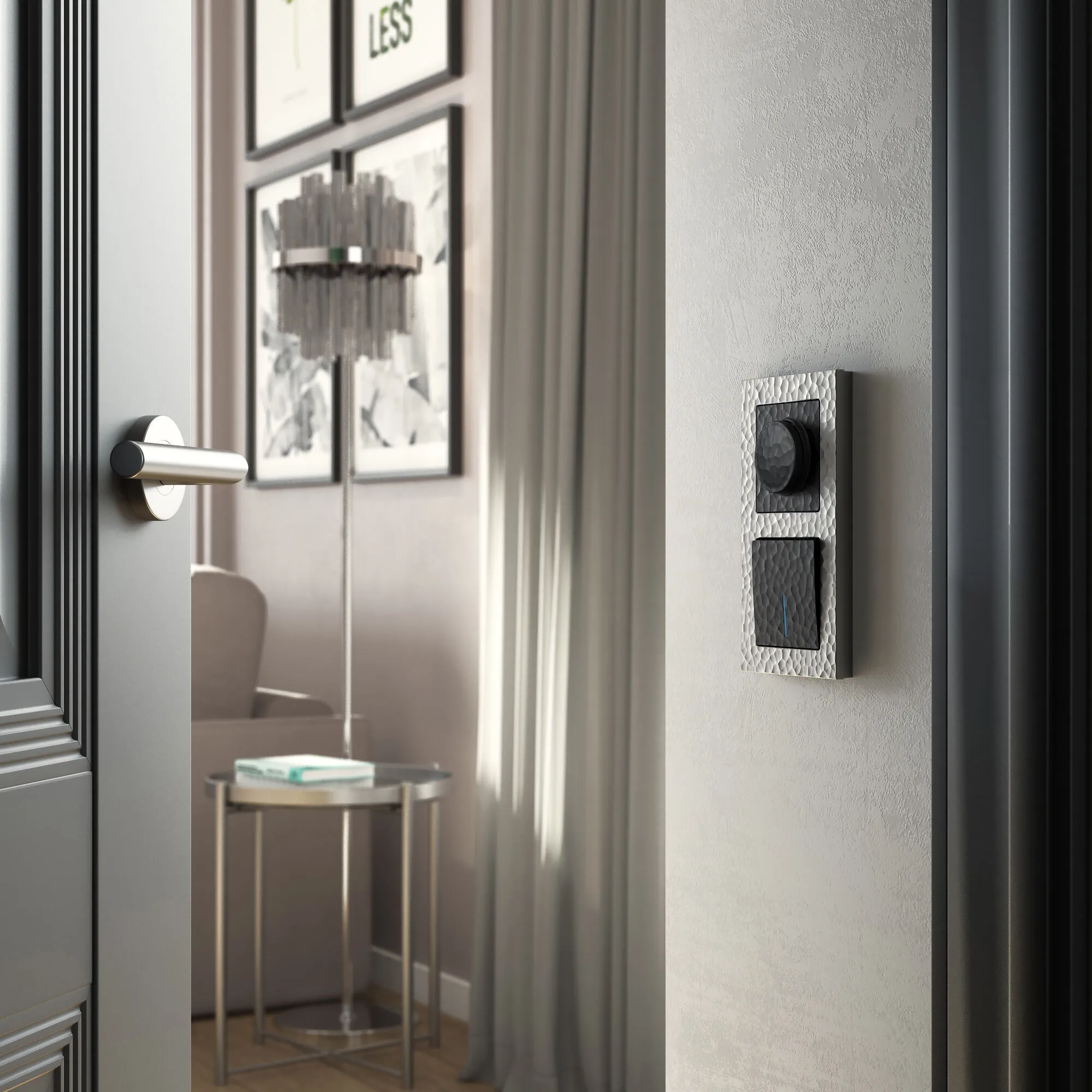 • Современный дизайн: Черный цвет и 3D-фактура придаёт выключателю лёгкую игру теней, которая оживляет поверхность без излишней вычурности.